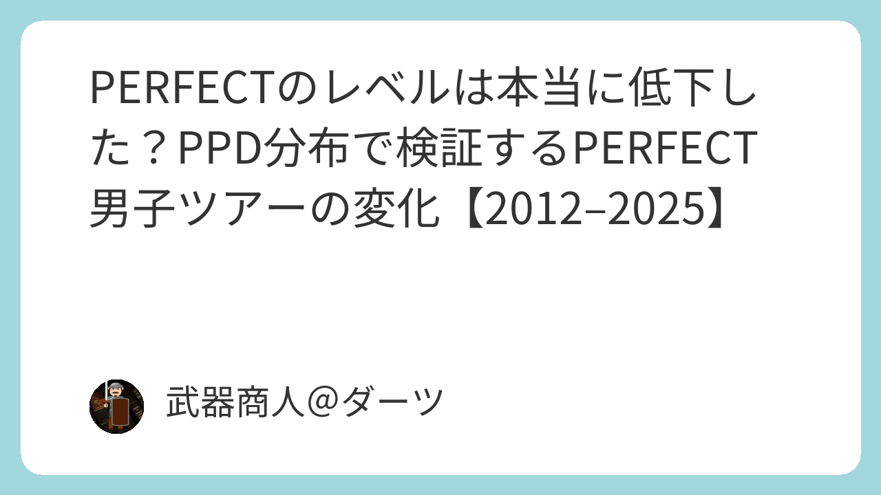 本記事では、PERFECT男子のPPDを指標として、2012年から2025年までのトップ20選手の分布を確認してきました。その結果、PERFECTのレベルを「上がった」「下がった」と単純に判断するのは難しく、時期ごとの分布の変化として見る必要があることが分かりました。