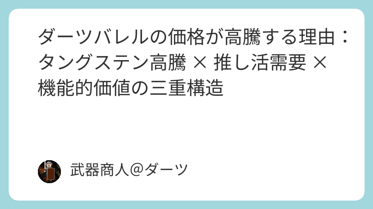 ダーツのバレルは本来、機能的価値が中心の精密スポーツ用品です。しかし推し活文化の急成長により、情緒的価値の比重が高まりすぎ、価格や需給に歪みが生まれています。